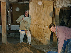 Zwei Mitarbeiter der Firma Linnemannstöns bei der Herstellung der Lehmmischung