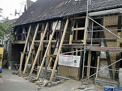 Der Kalender zeigt schon September. Die Arbeiten an der Baustelle schreiten voran. Ein großer Teil des Fassaden-Ständerwerks ist erneuert und die ersten Gefache sind mit Lehmsteinen ausgemauert worden. Neue Sockelsteine aus Anröchter Grünsandstein wurden eingebaut und in der 37. KW soll es ans Dach gehen.